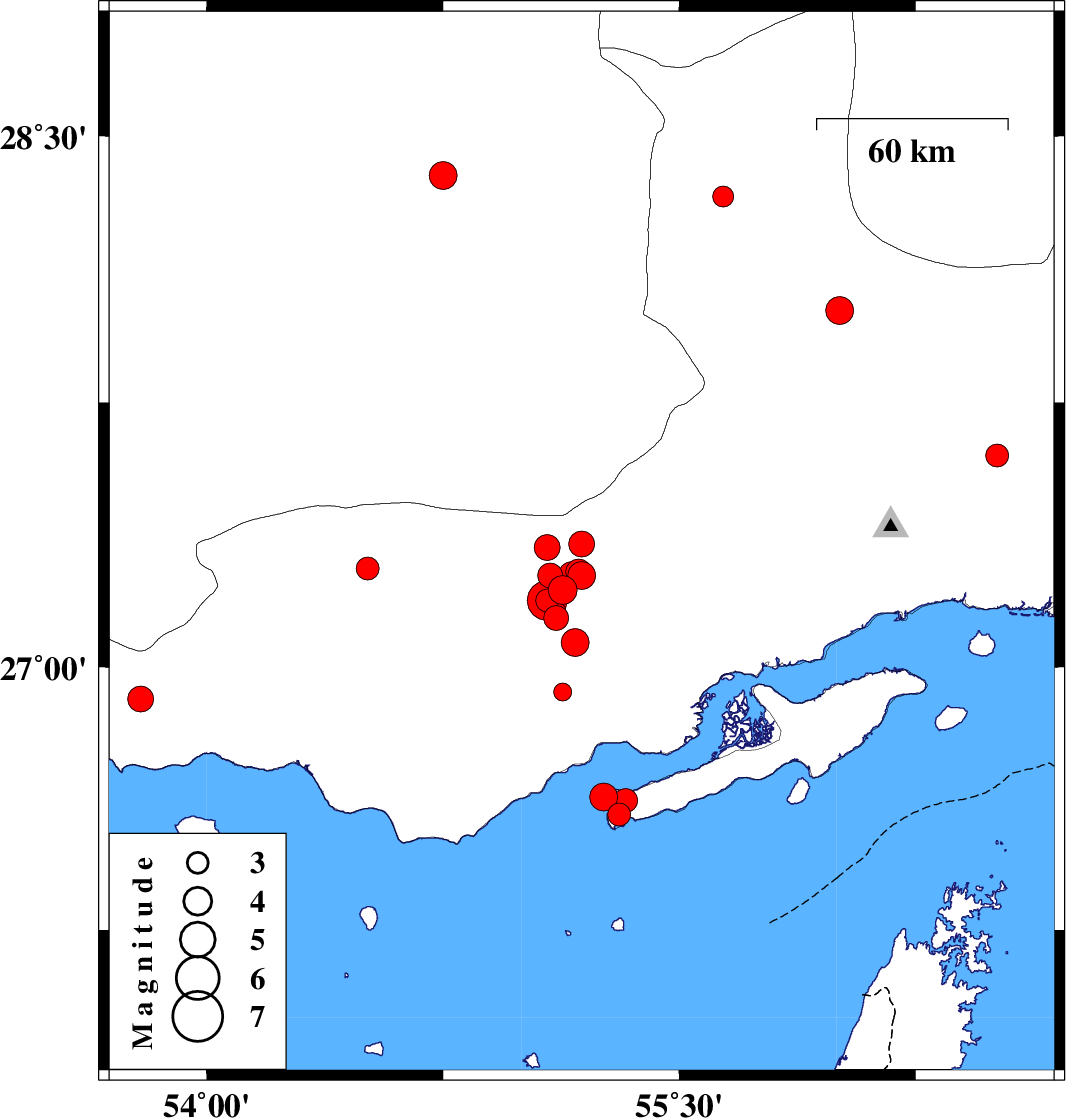 | 2019/10/18 | 04:09:38.8 | 07:39:38.8 | 26.63 | 55.26 | 14 | ML4 | Persian Gulf, 42 km North-East of Bandar-e lengeh | ||