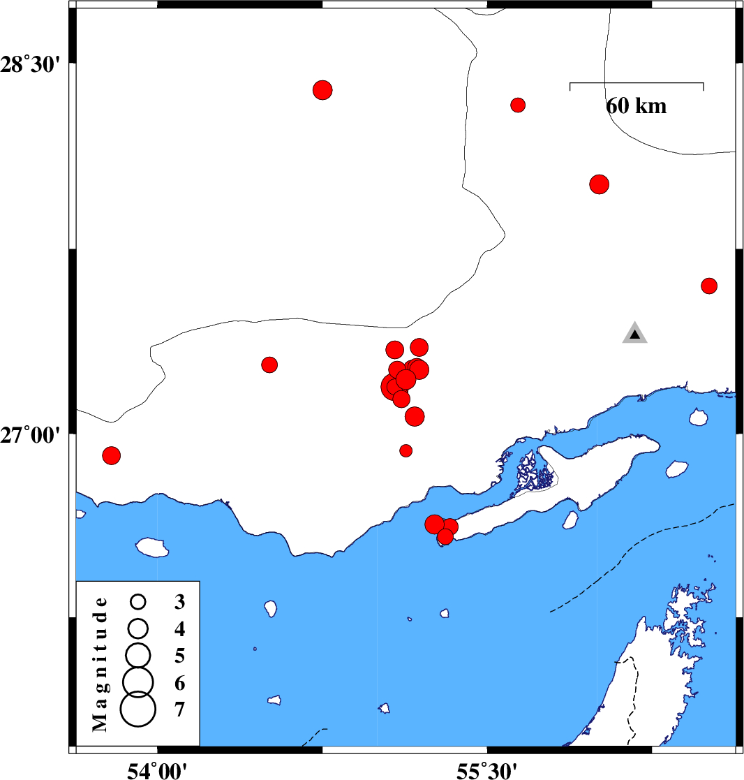 | 2019/10/18 | 04:09:38.8 | 07:39:38.8 | 26.63 | 55.26 | 14 | ML4 | Persian Gulf, 42 km North-East of Bandar-e lengeh | ||