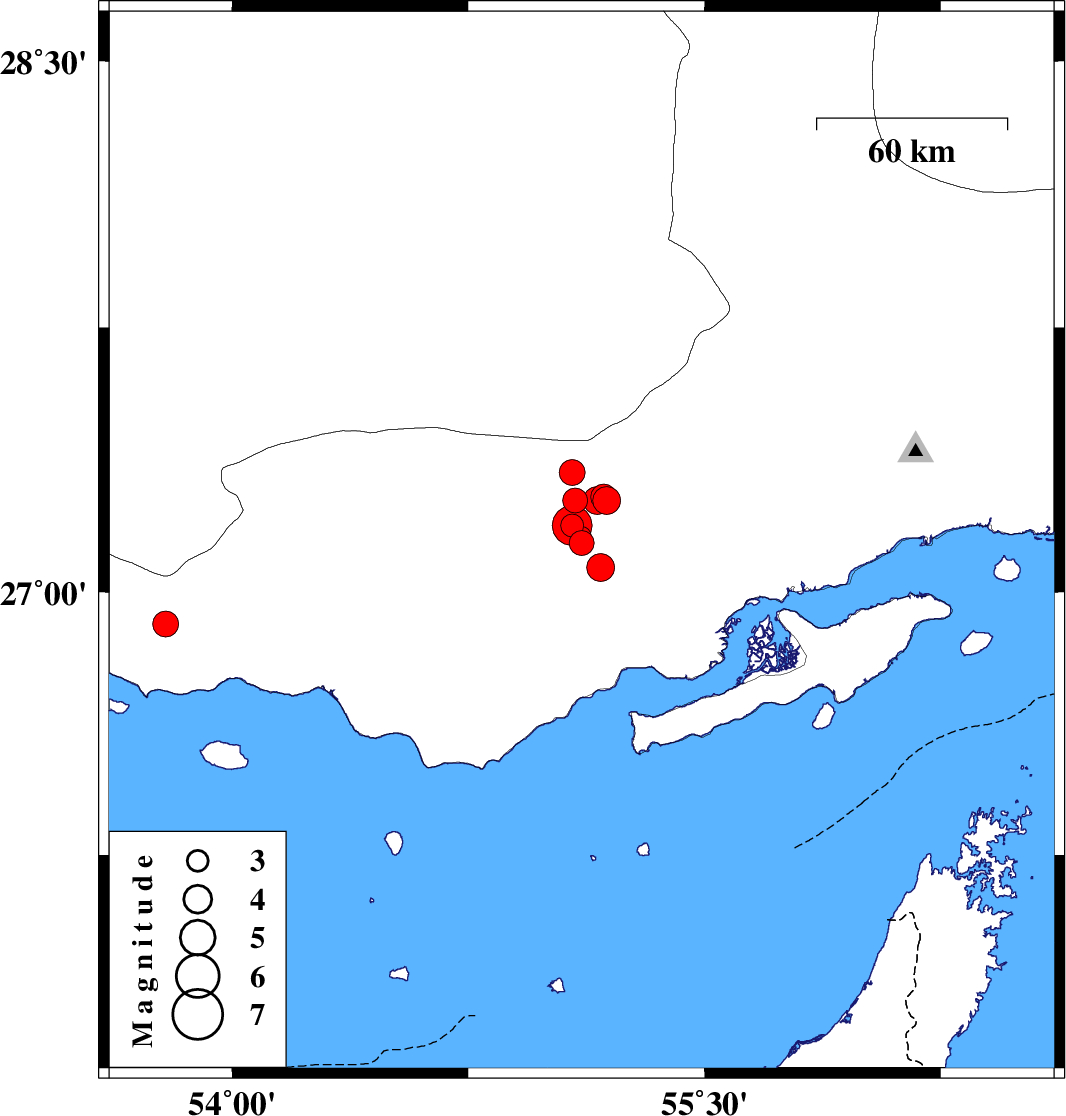 | 2019/10/22 | 04:33:20.1 | 08:03:20.1 | 27.07 | 55.17 | 14 | ML3.9 | Hormozgan Province, 68 km North-East of Bandar-e lengeh | ||