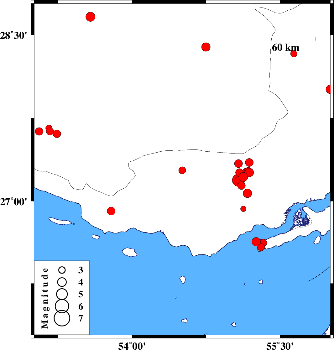 | 2019/10/18 | 04:09:38.8 | 07:39:38.8 | 26.63 | 55.26 | 14 | ML4 | Persian Gulf, 42 km North-East of Bandar-e lengeh | ||