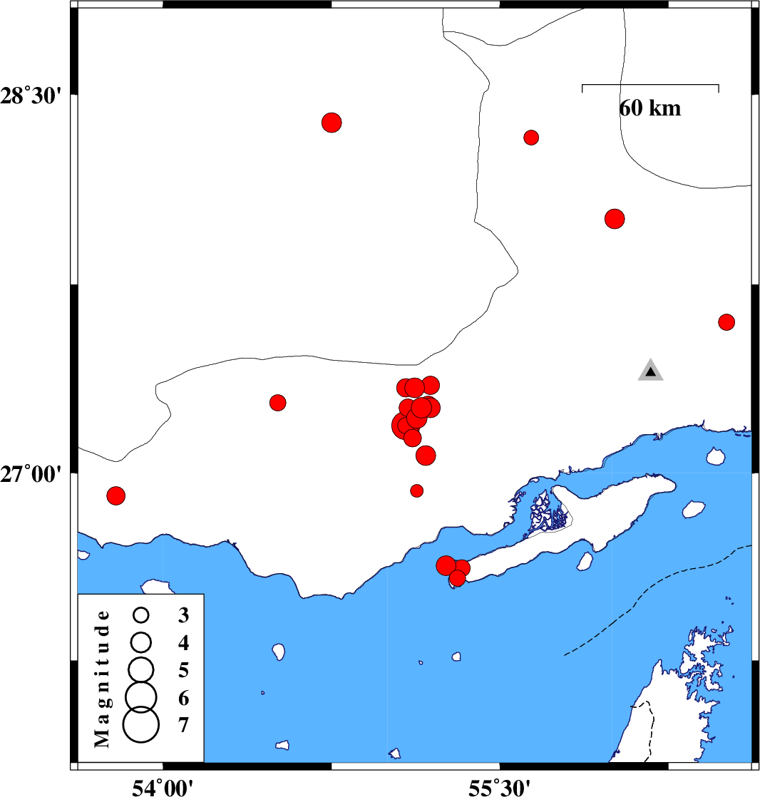 | 2019/10/18 | 04:09:38.8 | 07:39:38.8 | 26.63 | 55.26 | 14 | ML4 | Persian Gulf, 42 km North-East of Bandar-e lengeh | ||