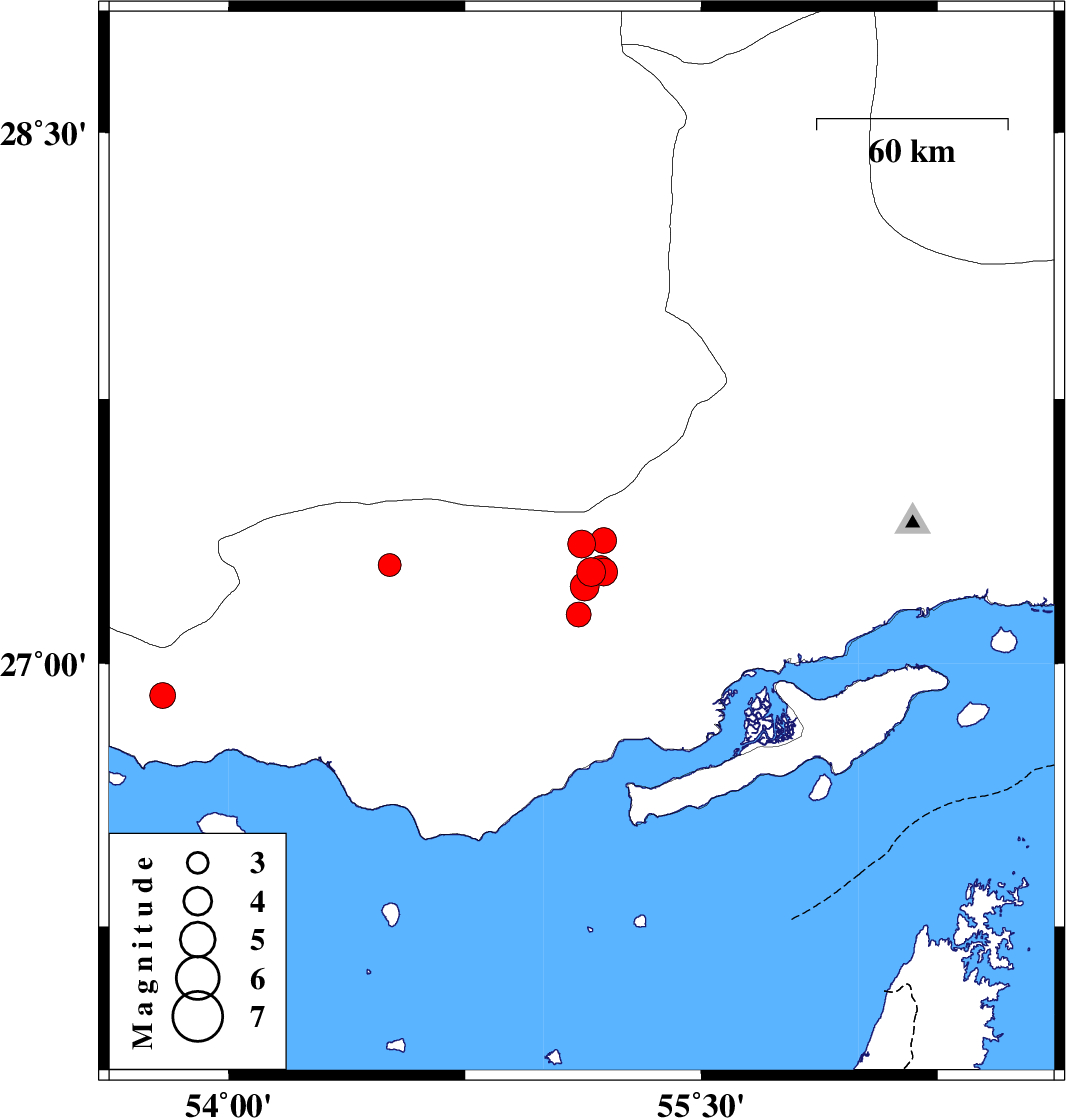 | 2019/10/23 | 01:08:12.9 | 04:38:12.9 | 27.27 | 55.18 | 14 | ML3.6 | Hormozgan Province, 81 km -East of Bastak |