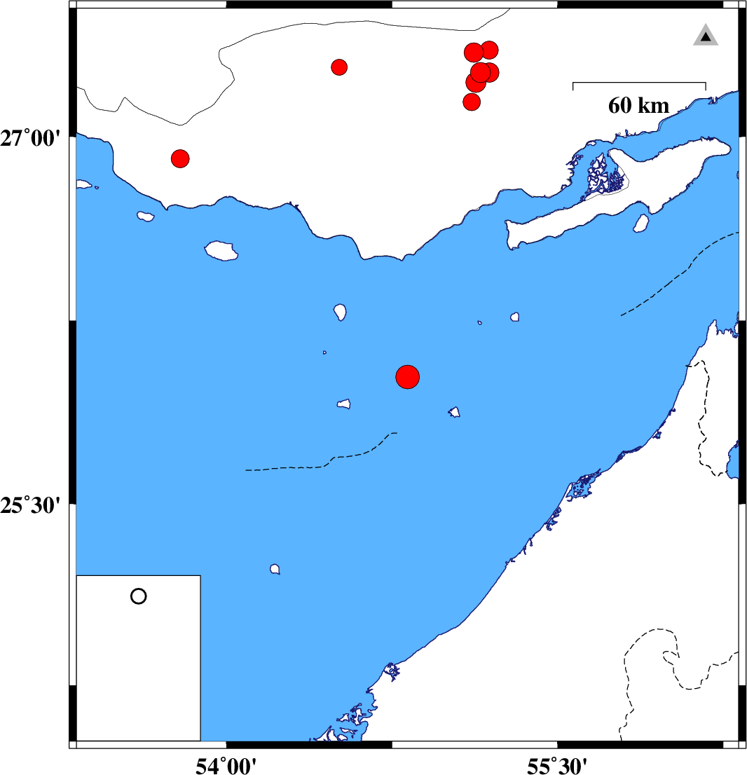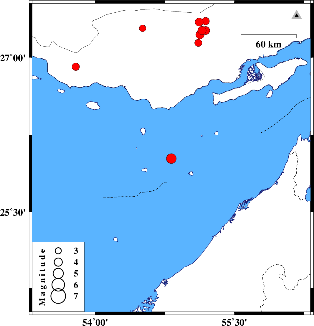 | 2019/10/31 | 15:43:58.5 | 19:13:58.5 | 26.02 | 54.82 | 10 | ML4.8 | Persian Gulf, 27 km North-West of Abu Musa | ||