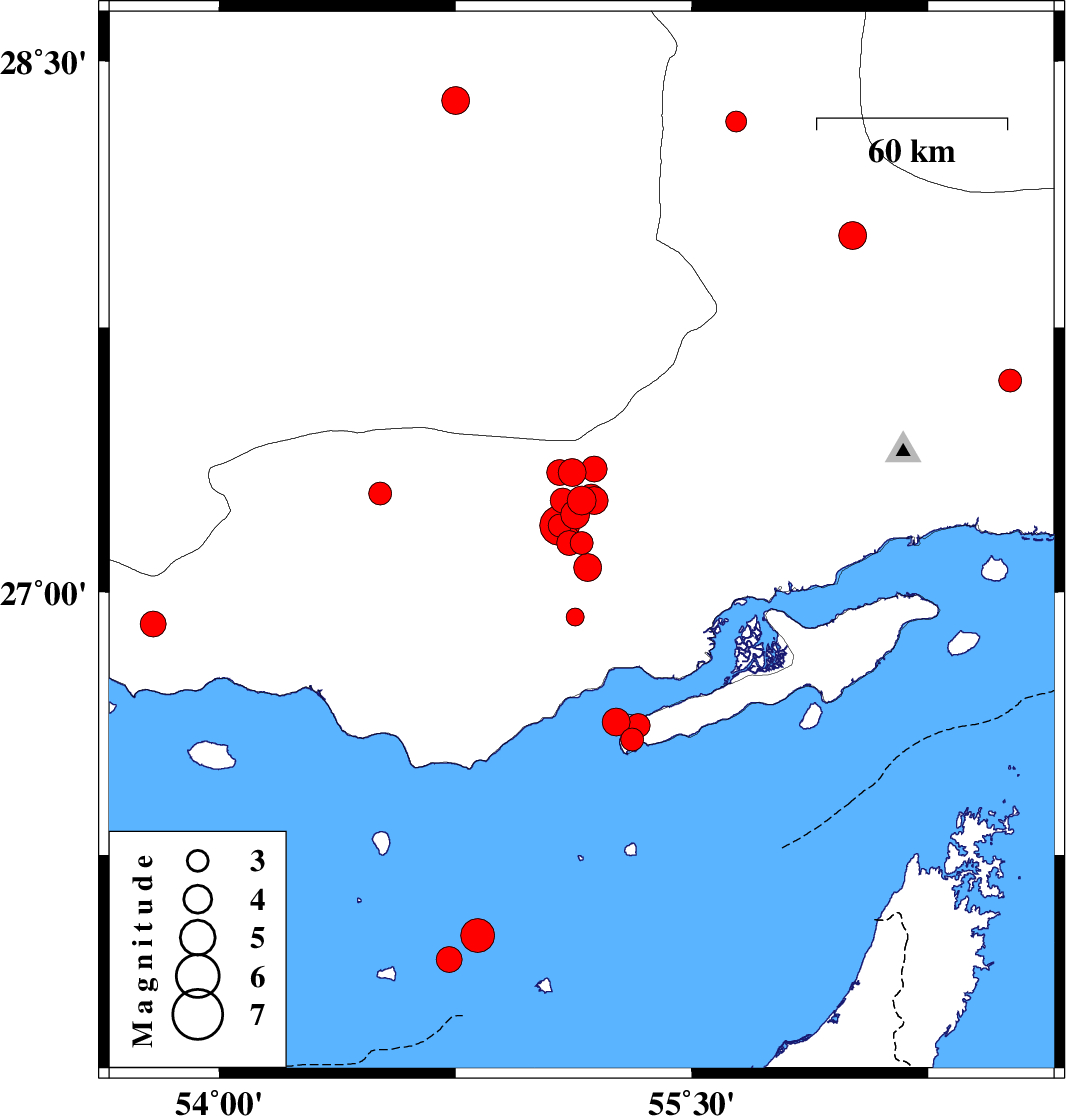 | 2019/10/18 | 04:09:38.8 | 07:39:38.8 | 26.63 | 55.26 | 14 | ML4 | Persian Gulf, 42 km North-East of Bandar-e lengeh | ||
