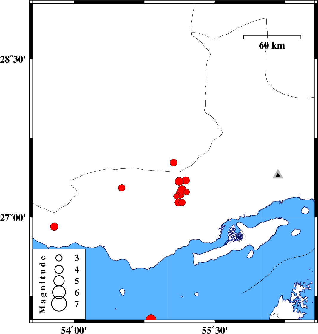 | 2019/10/30 | 11:33:06.9 | 15:03:06.9 | 27.34 | 55.12 | 14 | ML4 | Hormozgan Province, 76 km North-East of Bastak | ||