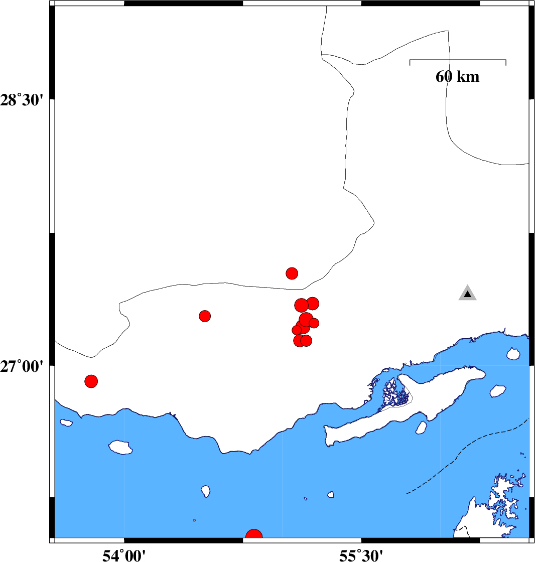 | 2019/10/29 | 00:16:28.2 | 03:46:28.2 | 27.28 | 54.51 | 14 | ML3.3 | Hormozgan Province, 17 km -East of Bastak | ||