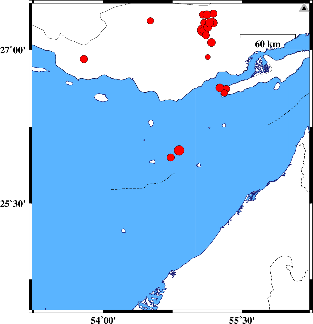 | 2019/11/01 | 10:04:40.2 | 13:34:40.2 | 25.95 | 54.73 | 14 | ML3.6 | Persian Gulf, 32 km -West of Abu Musa | ||