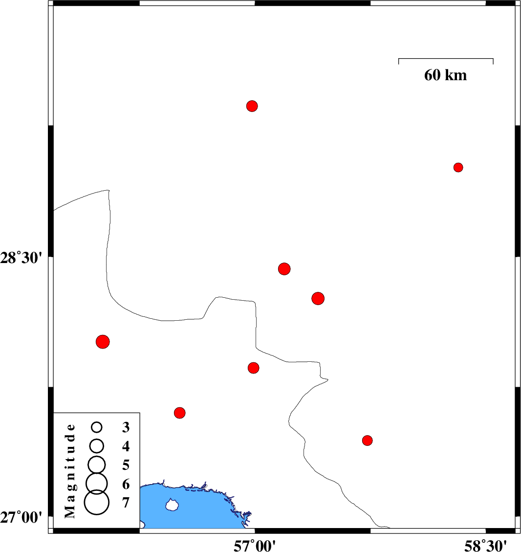 | 2019/11/04 | 16:59:23.5 | 20:29:23.5 | 28.43 | 57.19 | 10 | ML3.5 | Kerman Province, 60 km South-West of Jiroft | ||