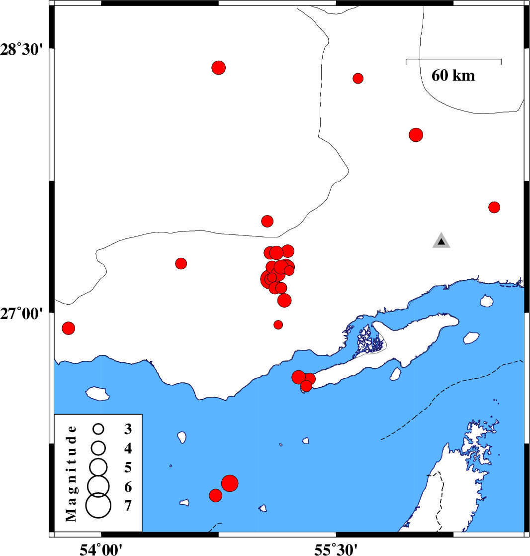 | 2019/10/18 | 04:09:38.8 | 07:39:38.8 | 26.63 | 55.26 | 14 | ML4 | Persian Gulf, 42 km North-East of Bandar-e lengeh | ||