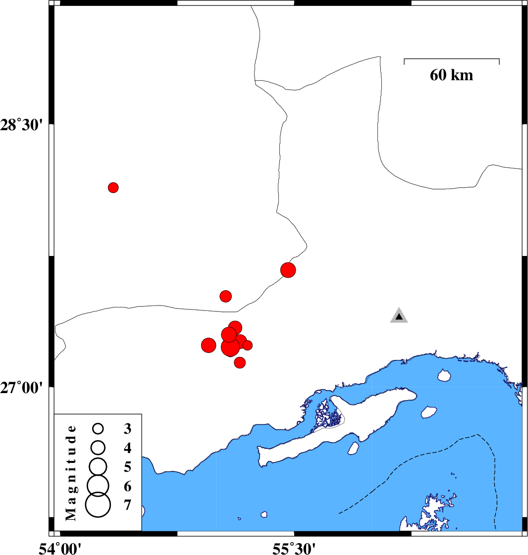 | 2019/11/06 | 16:28:53.2 | 19:58:53.2 | 27.3 | 55.08 | 23 | ML4.4 | Hormozgan Province, 72 km North-East of Bastak | ||