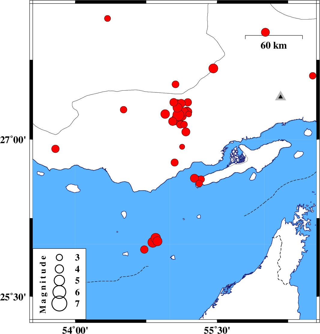 | 2019/11/01 | 10:04:40.2 | 13:34:40.2 | 25.95 | 54.73 | 14 | ML3.6 | Persian Gulf, 32 km -West of Abu Musa | ||