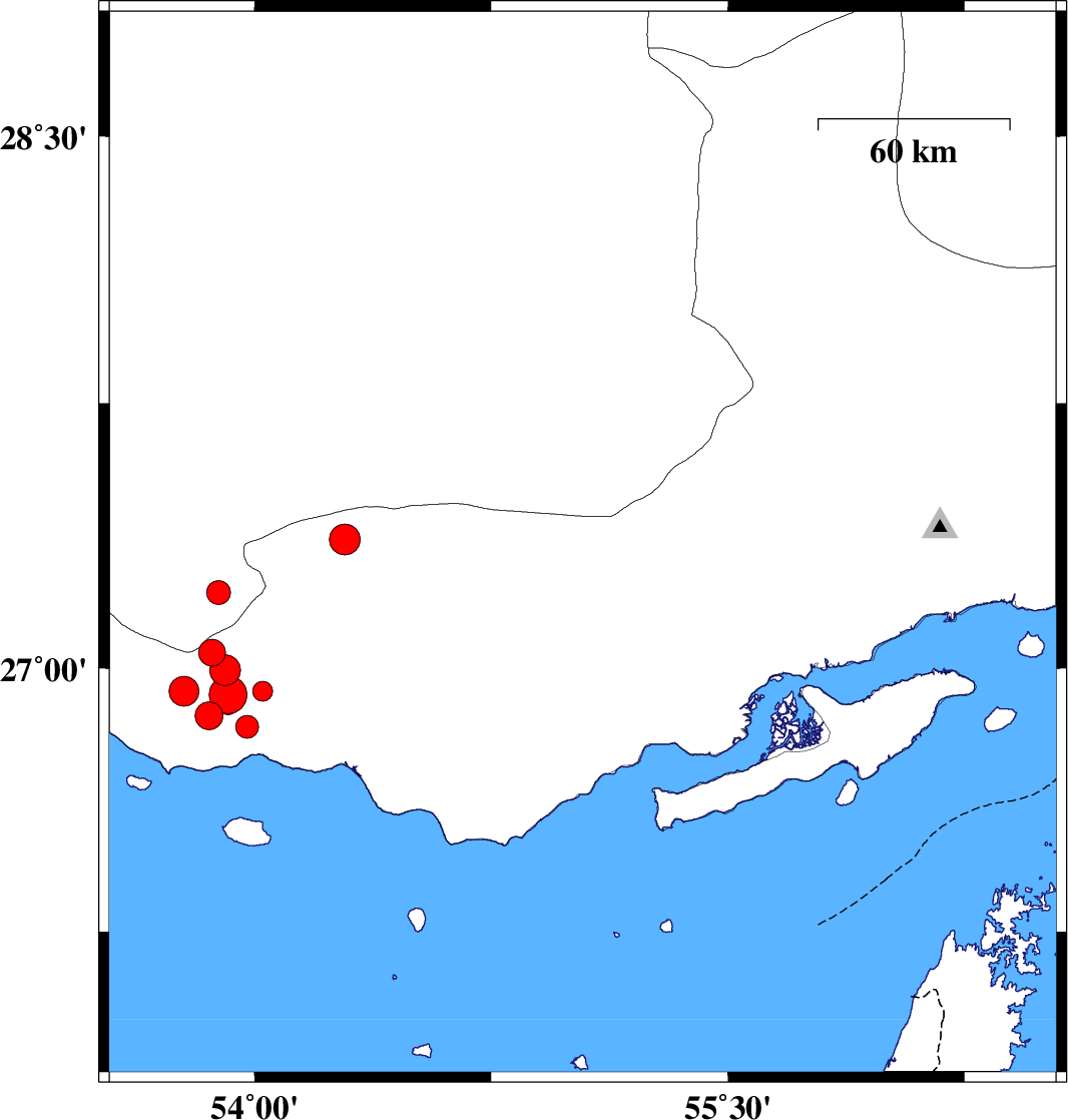 | 2019/10/31 | 15:43:58.5 | 19:13:58.5 | 26.02 | 54.82 | 10 | ML4.8 | Persian Gulf, 27 km North-West of Abu Musa |