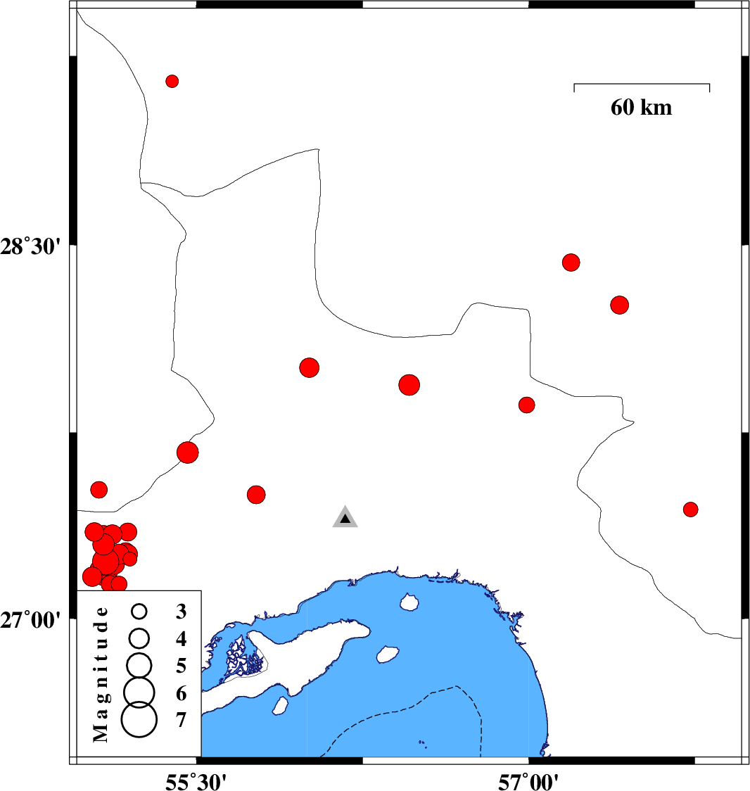 | 2019/11/06 | 16:28:53.2 | 19:58:53.2 | 27.3 | 55.08 | 23 | ML4.4 | Hormozgan Province, 72 km North-East of Bastak | ||