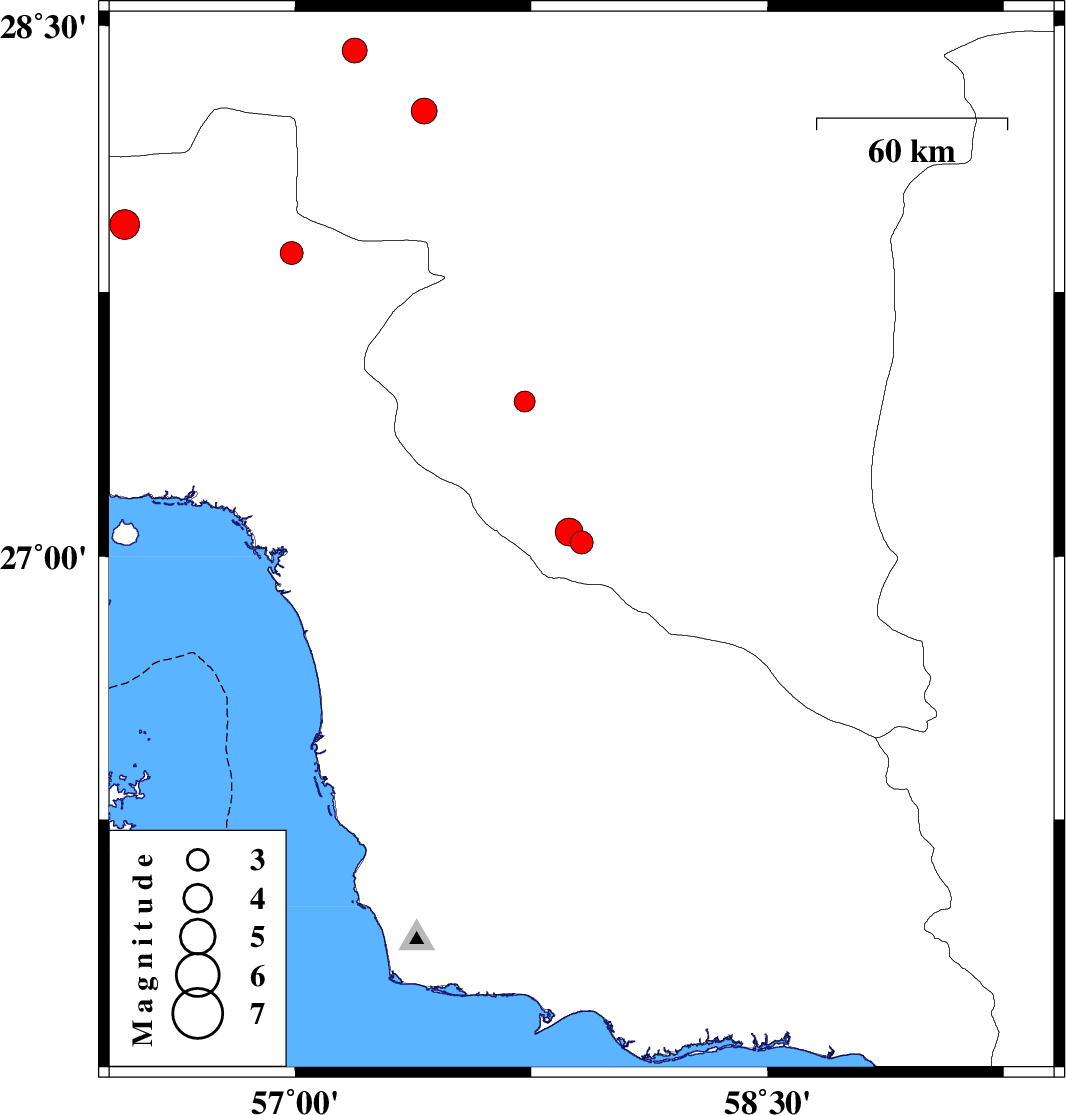 | 2019/11/04 | 16:59:23.5 | 20:29:23.5 | 28.43 | 57.19 | 10 | ML3.5 | Kerman Province, 60 km South-West of Jiroft | ||