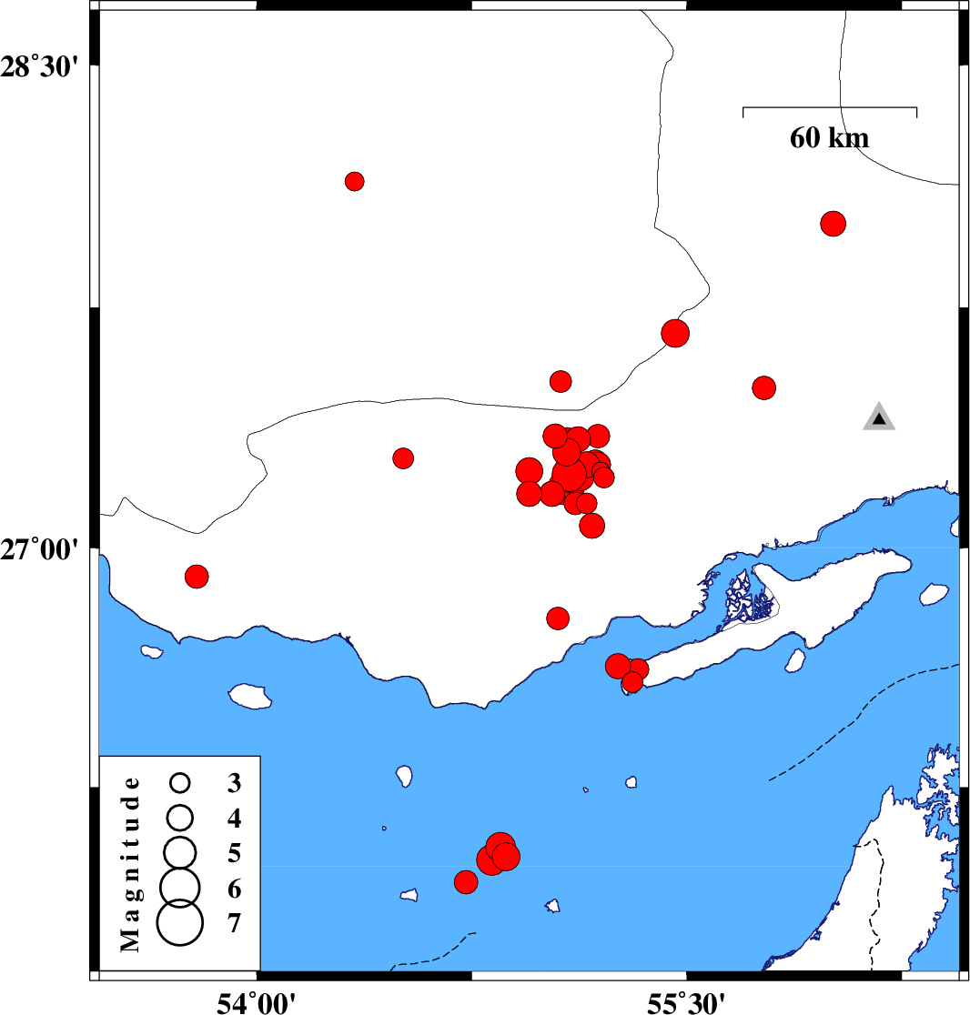 | 2019/10/18 | 04:09:38.8 | 07:39:38.8 | 26.63 | 55.26 | 14 | ML4 | Persian Gulf, 42 km North-East of Bandar-e lengeh | ||