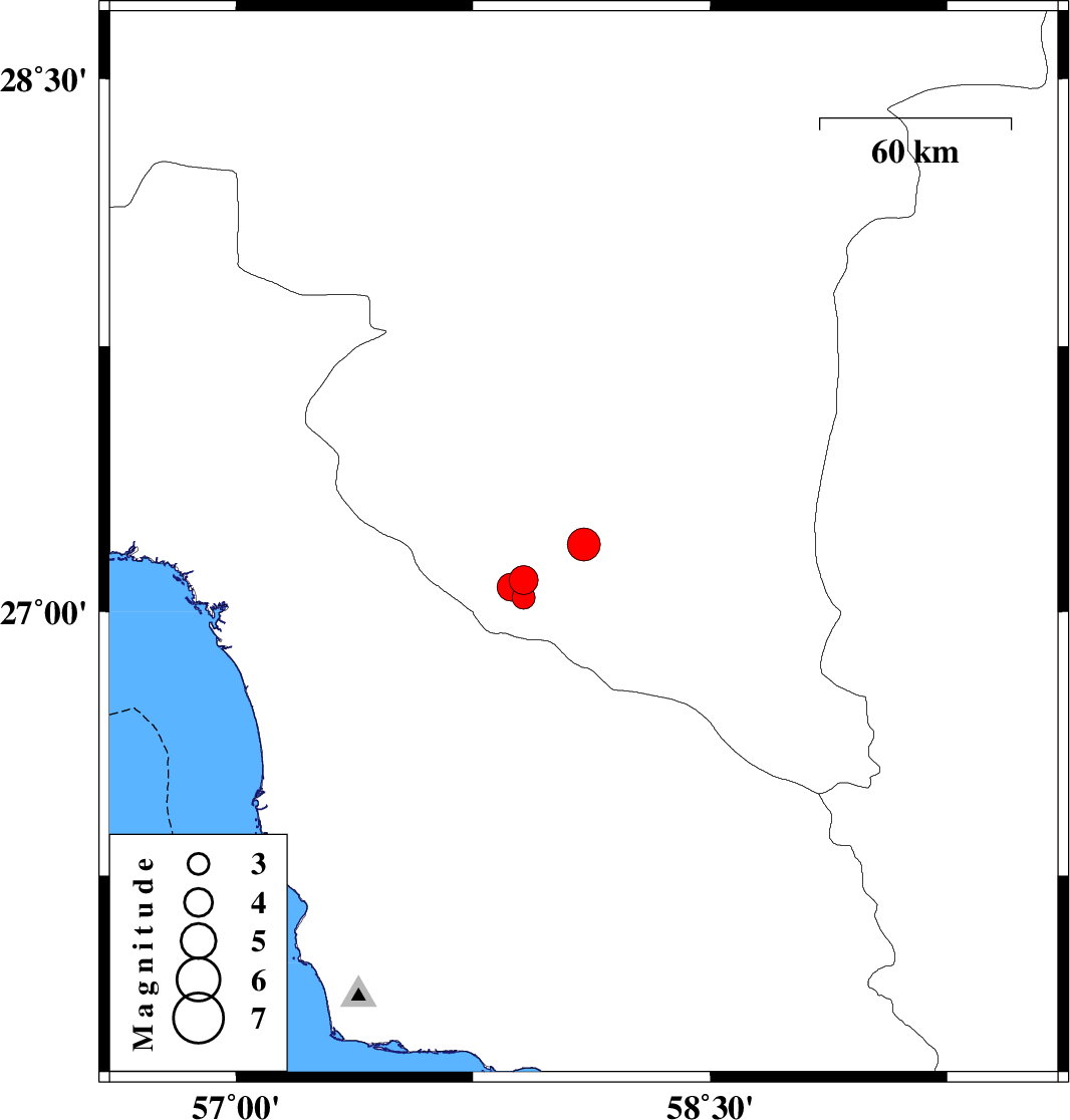 | 2019/11/11 | 00:12:29.8 | 03:42:29.8 | 27.07 | 57.87 | 14 | ML4 | Kerman Province, 53 km South-East of Manujan |