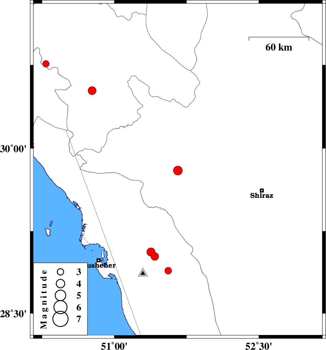 2019/10/18 | 05:09:55.9 | 08:39:55.9 | 29.02 | 51.42 | 14 | ML3.7 | Bushehr Province, 22 km North-East of Ahram | ||