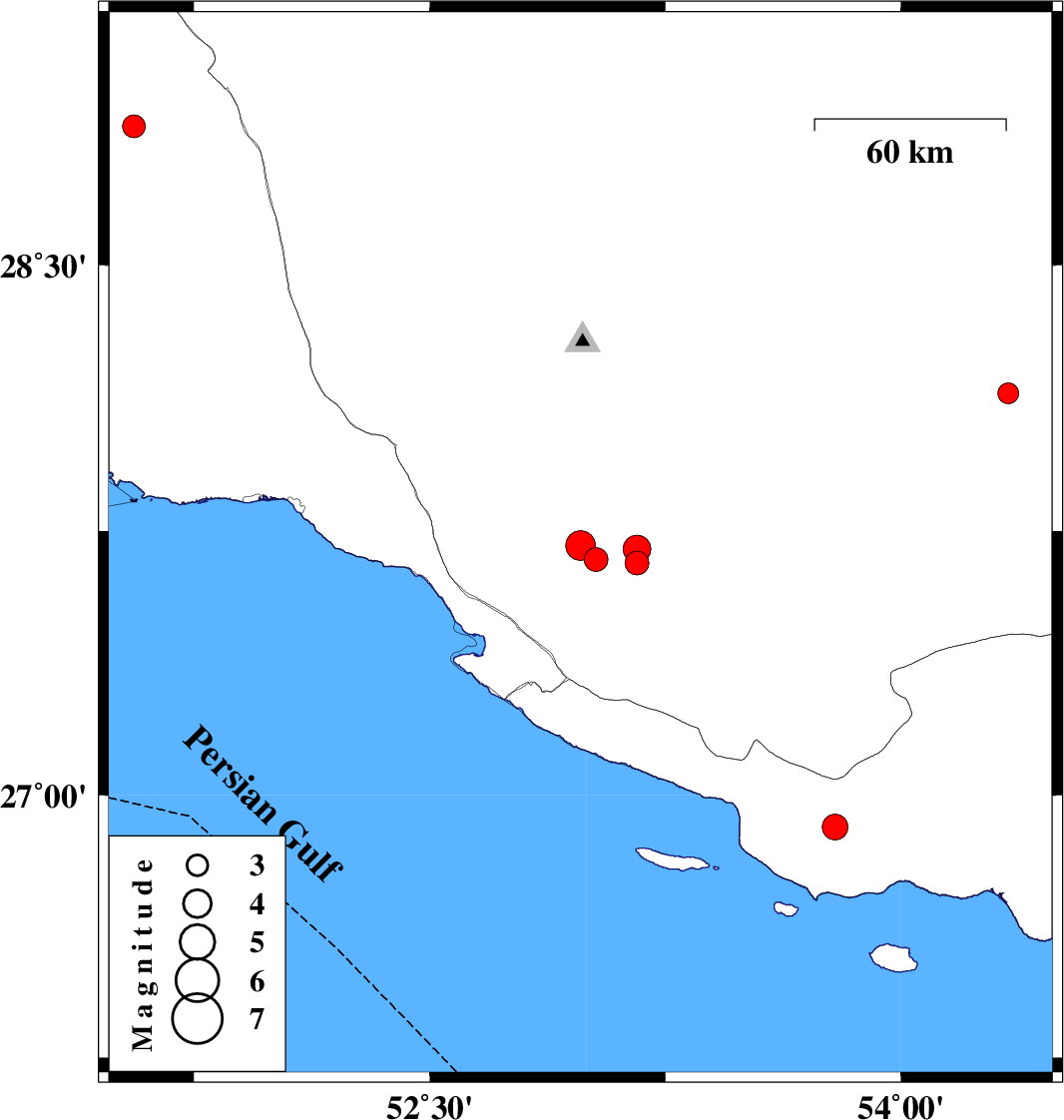 | 2019/10/16 | 01:26:17.8 | 04:56:17.8 | 28.89 | 51.56 | 14 | ML3.2 | Bushehr Province, 29 km -East of Ahram |