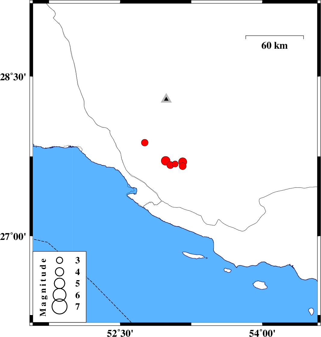 | 2019/11/14 | 00:23:28.2 | 03:53:28.2 | 27.88 | 52.76 | 10 | ML3.2 | Fars Province, 39 km North-West of Mehr | ||