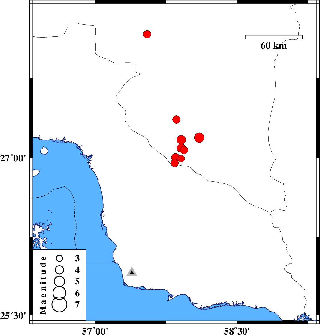 | 2019/11/12 | 08:25:22.1 | 11:55:22.1 | 27.19 | 58.1 | 14 | Mb4.6 | Kerman Province, 65 km South-East of Manujan |