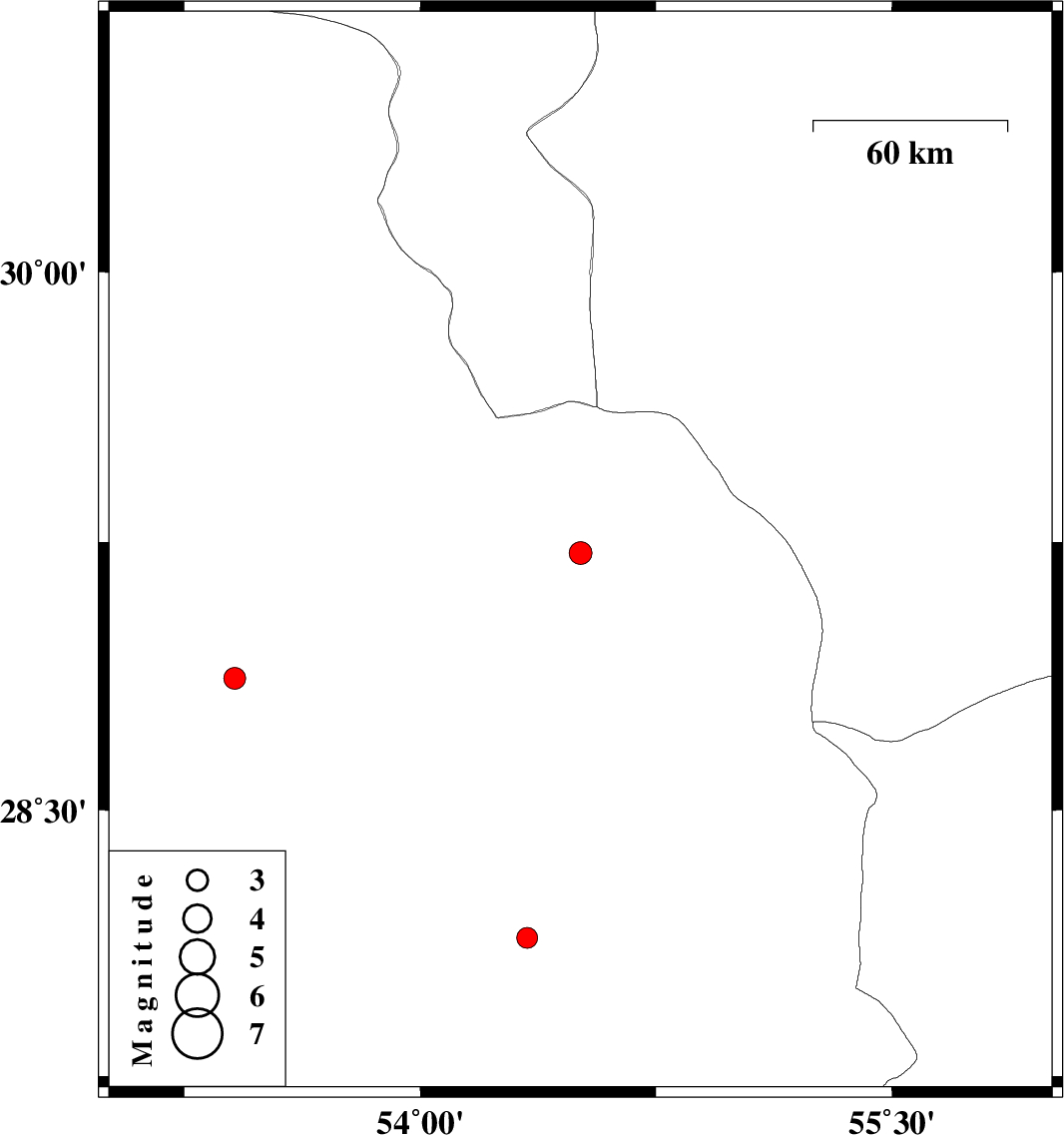 | 2019/11/05 | 01:17:55.8 | 04:47:55.8 | 28.14 | 54.34 | 14 | ML2.9 | Fars Province, 51 km North of Lar |
