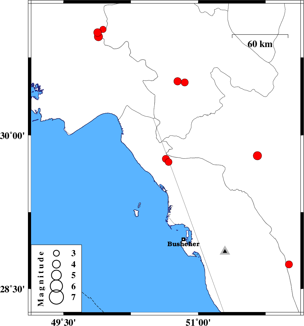 2019/11/25 | 12:30:52.1 | 16:00:52.1 | 29.77 | 50.64 | 14 | ML3.6 | Bushehr Province, 25 km North-East of Bandar-e genaveh | ||