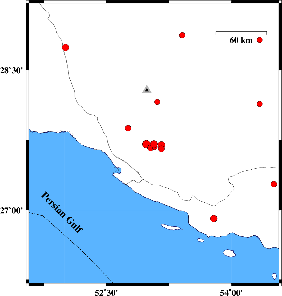 | 2019/11/14 | 00:23:28.2 | 03:53:28.2 | 27.88 | 52.76 | 10 | ML3.2 | Fars Province, 39 km North-West of Mehr | ||