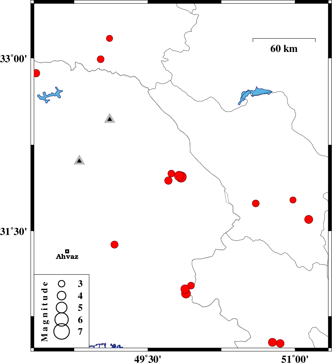| 2019/11/23 | 13:45:32.9 | 17:15:32.9 | 30.99 | 49.88 | 12 | ML3.9 | Khoozestan Province, 30 km North-East of Omidiyeh | ||