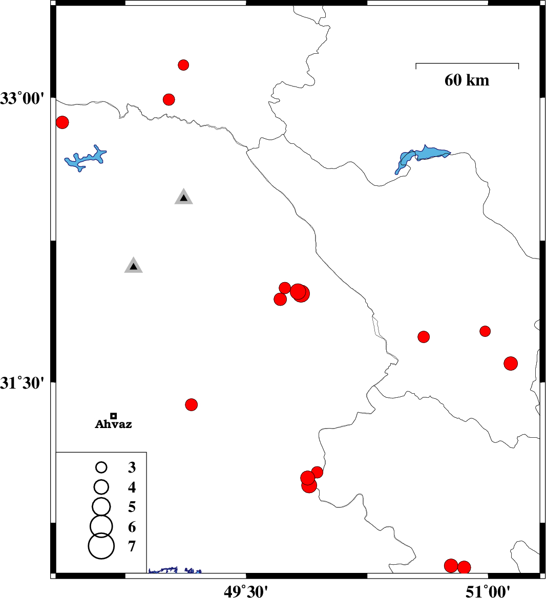 | 2019/11/23 | 13:45:32.9 | 17:15:32.9 | 30.99 | 49.88 | 12 | ML3.9 | Khoozestan Province, 30 km North-East of Omidiyeh | ||