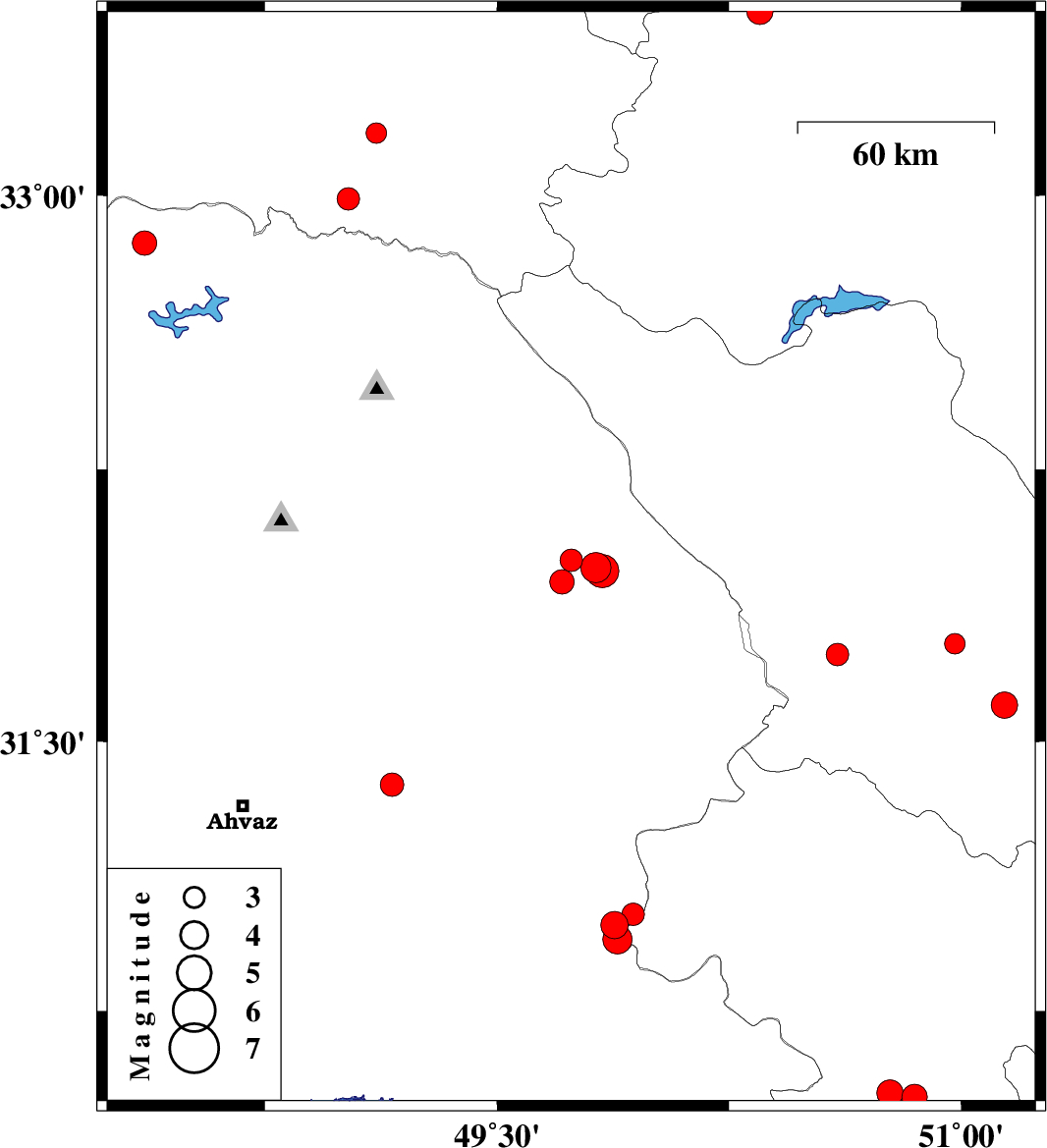 | 2019/11/23 | 13:45:32.9 | 17:15:32.9 | 30.99 | 49.88 | 12 | ML3.9 | Khoozestan Province, 30 km North-East of Omidiyeh | ||