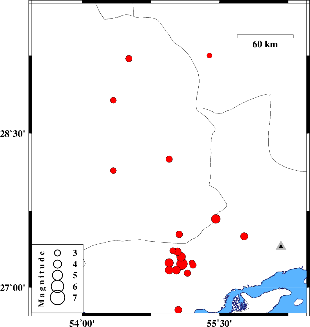 | 2019/11/06 | 16:28:53.2 | 19:58:53.2 | 27.3 | 55.08 | 23 | ML4.4 | Hormozgan Province, 72 km North-East of Bastak | ||