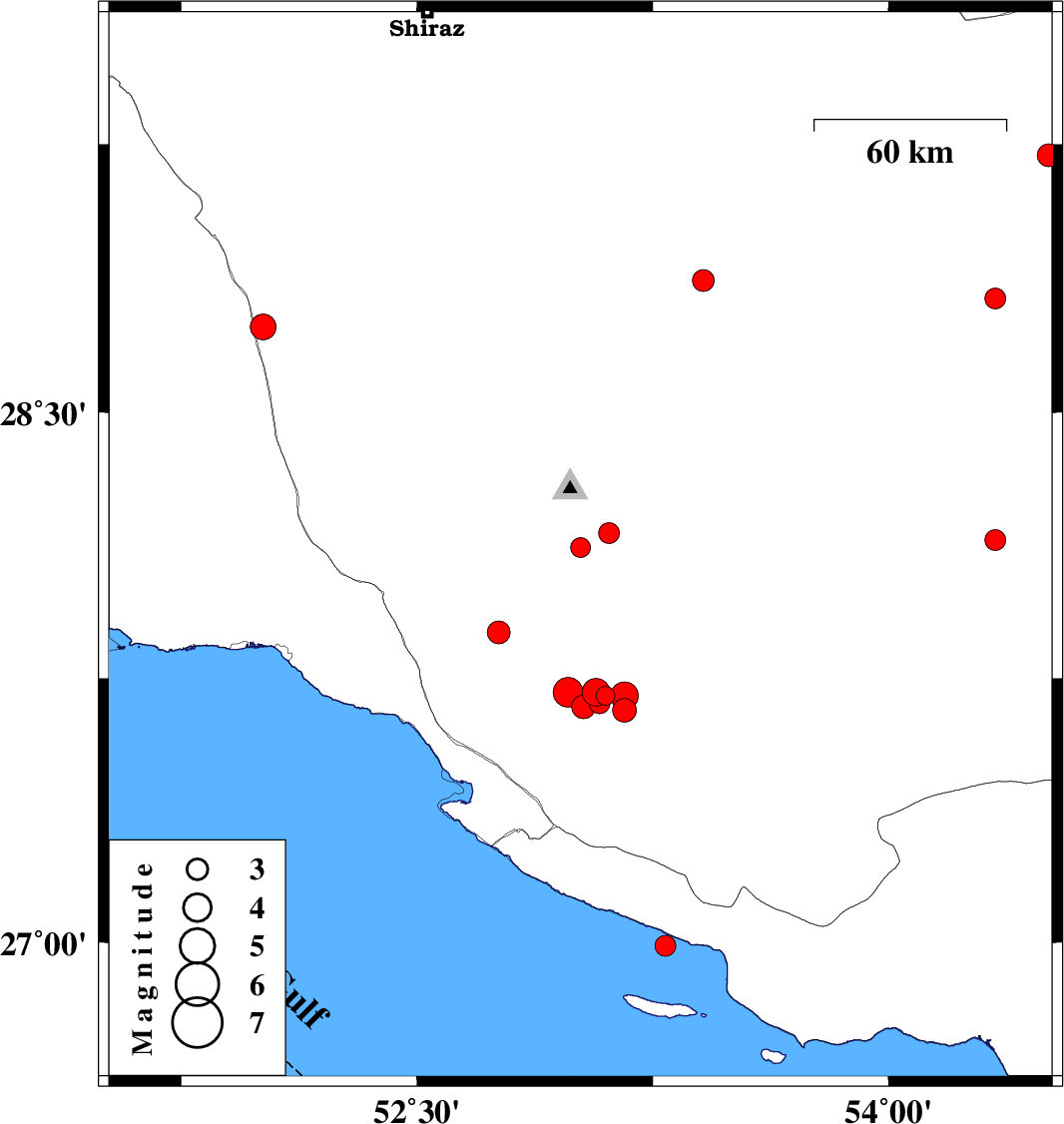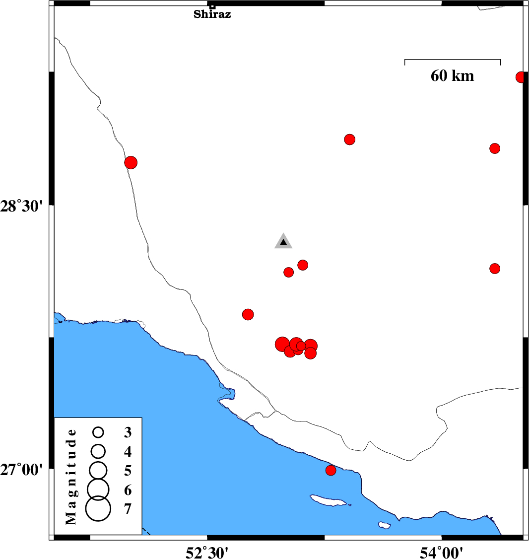 | 2019/11/14 | 00:23:28.2 | 03:53:28.2 | 27.88 | 52.76 | 10 | ML3.2 | Fars Province, 39 km North-West of Mehr | ||