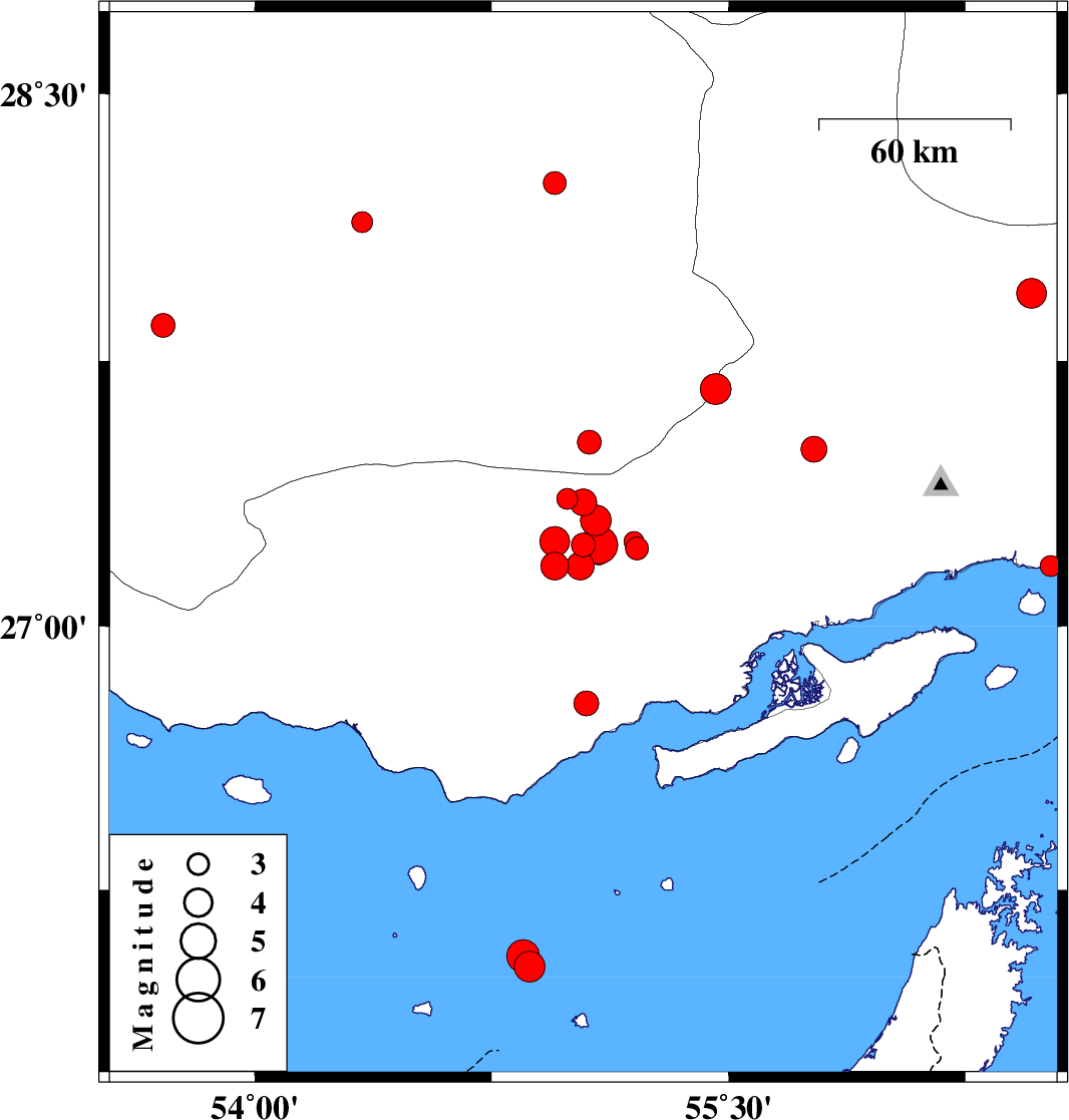 | 2019/11/12 | 06:00:59.5 | 09:30:59.5 | 27.17 | 54.95 | 14 | ML4 | Hormozgan Province, 58 km -East of Bastak | ||