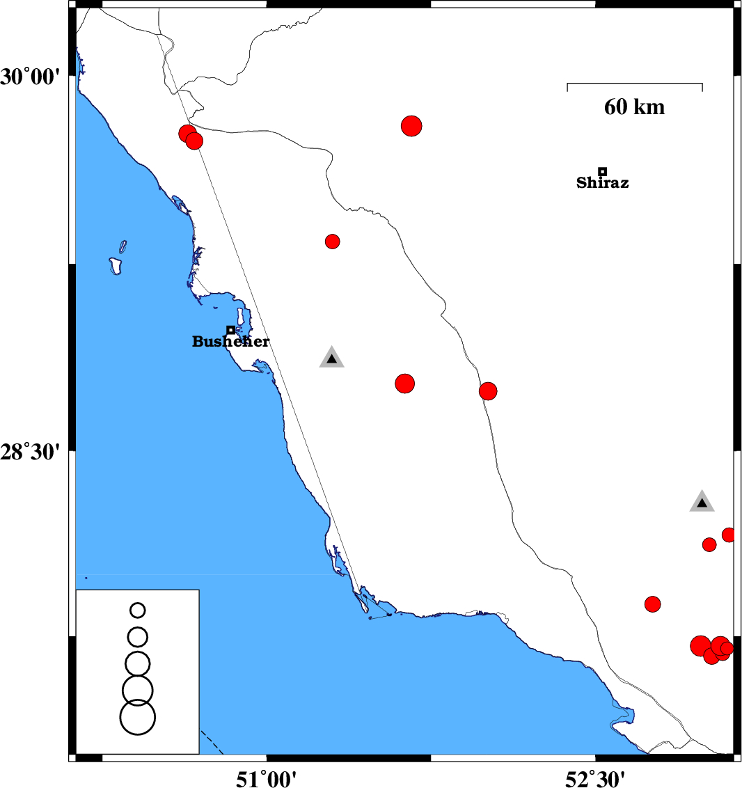 | 2019/12/03 | 14:43:07.4 | 18:13:07.4 | 28.77 | 51.63 | 15 | ML4 | Bushehr Province, 29 km North-East of Khormog | ||