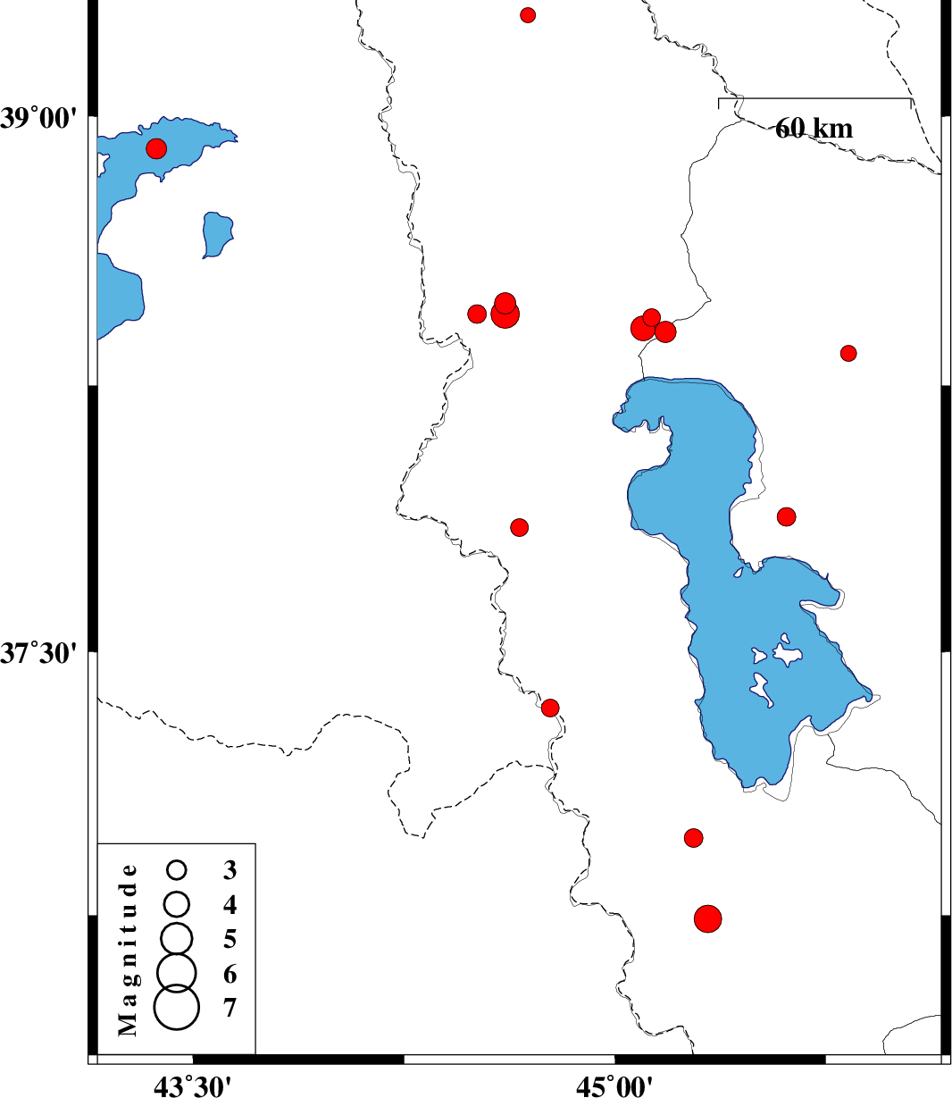 2019/11/23 | 19:21:45.3 | 22:51:45.3 | 37.34 | 44.77 | 14 | ML:2.8 | Azarbaijan Gharbi Province, 35 km South-West of Orumiyeh | ||