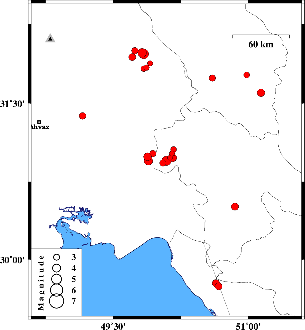 | 2019/11/23 | 13:45:32.9 | 17:15:32.9 | 30.99 | 49.88 | 12 | ML3.9 | Khoozestan Province, 30 km North-East of Omidiyeh | ||