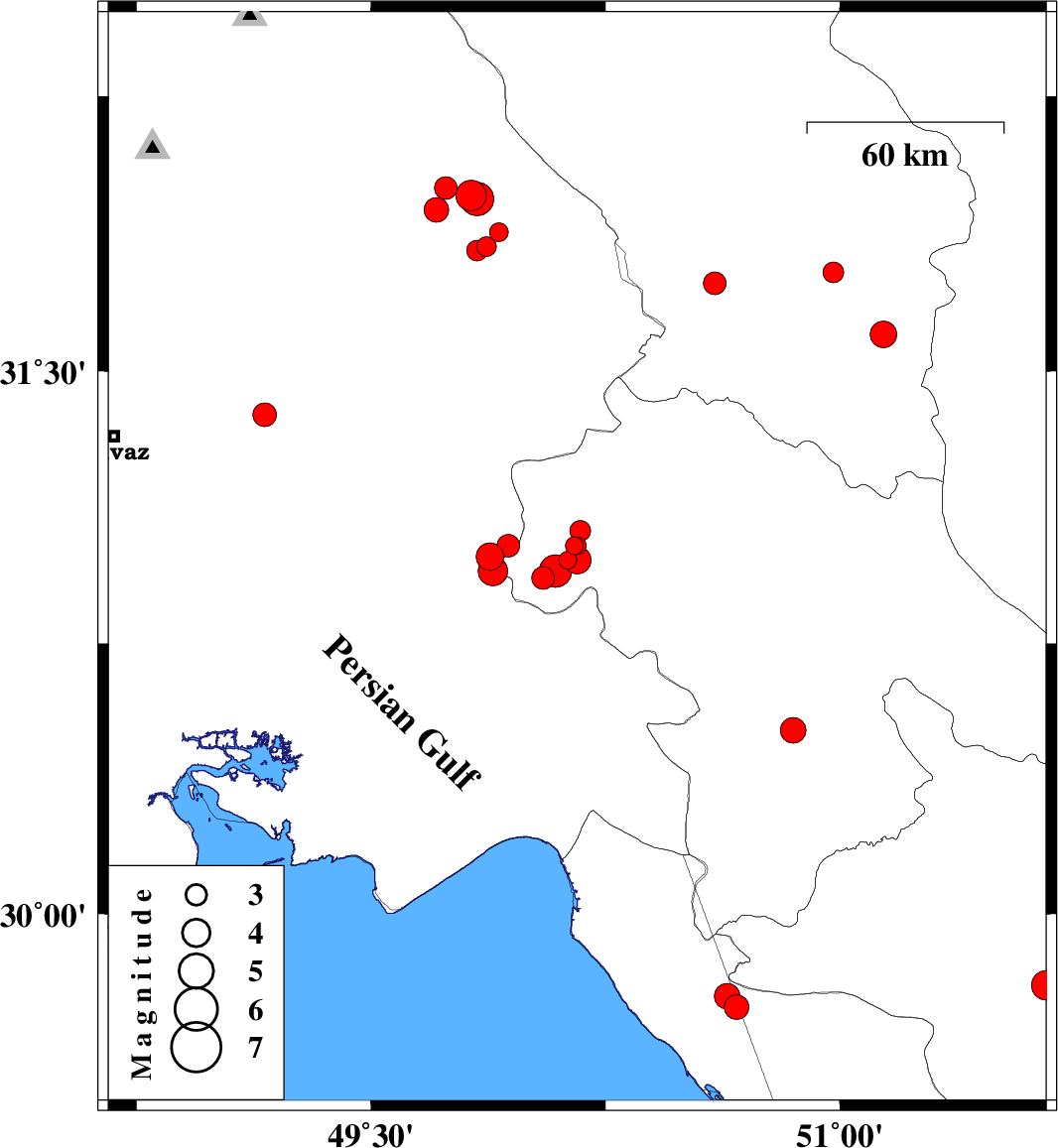 | 2019/11/23 | 12:42:17.5 | 16:12:17.5 | 31.02 | 49.94 | 14 | ML3.2 | Khoozestan Province, 36 km North-East of Omidiyeh | ||