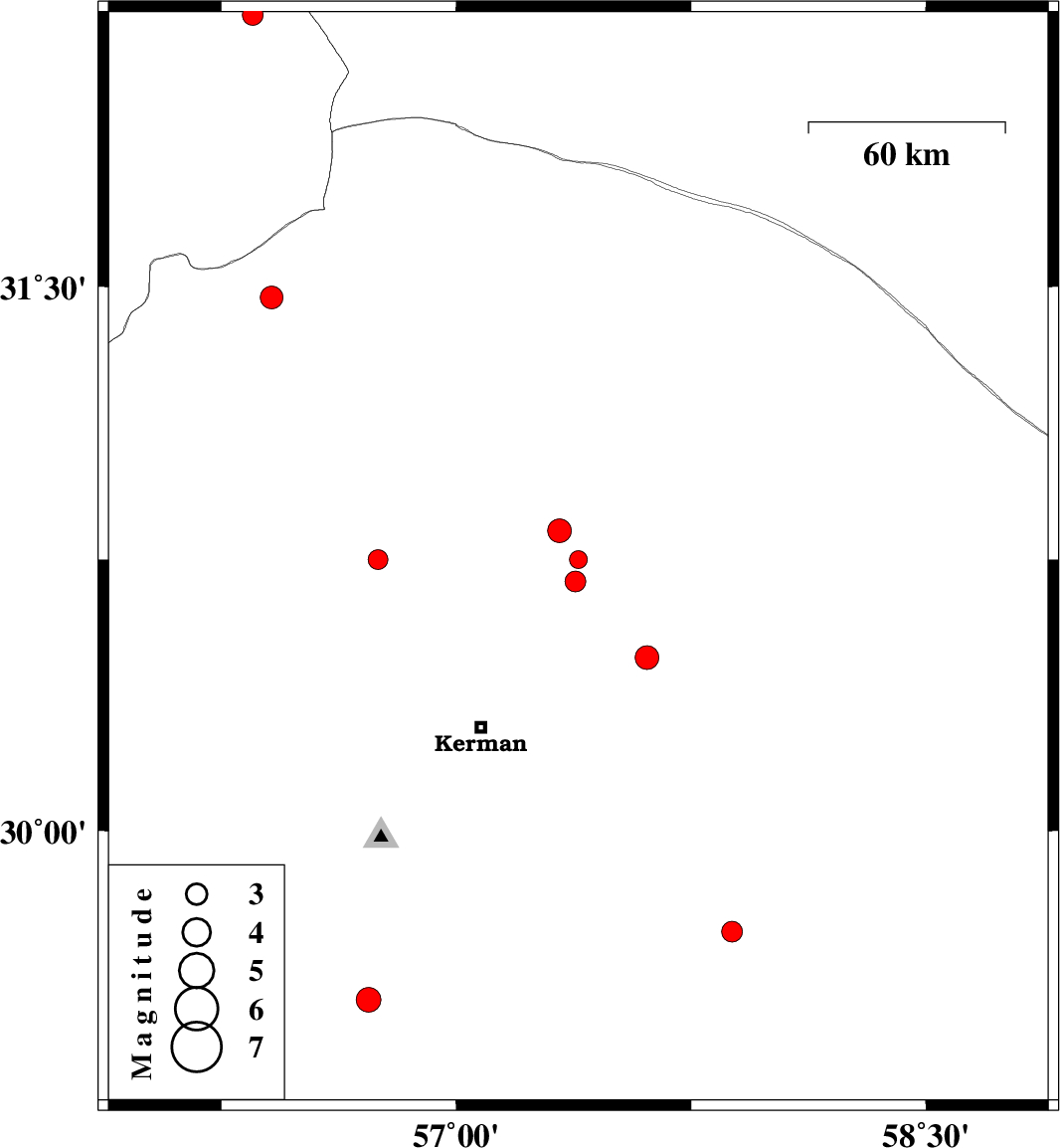 | 2019/12/06 | 19:13:36.5 | 22:43:36.5 | 30.48 | 57.61 | 10 | ML3.4 | Kerman Province, 55 km North-East of Kerman | ||