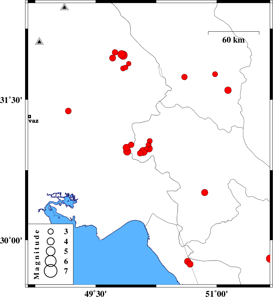 | 2019/11/23 | 12:42:17.5 | 16:12:17.5 | 31.02 | 49.94 | 14 | ML3.2 | Khoozestan Province, 36 km North-East of Omidiyeh | ||