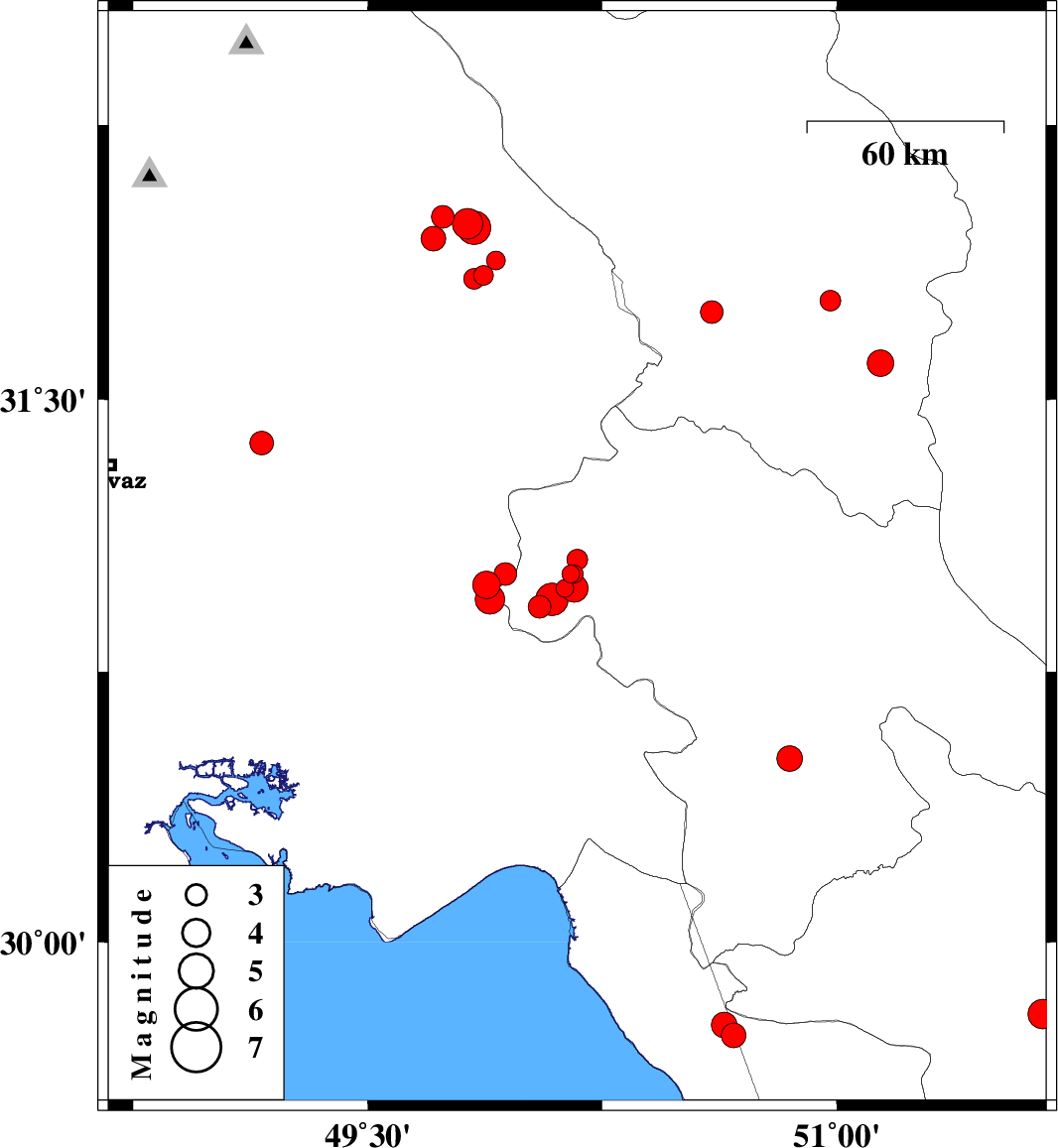 | 2019/11/23 | 12:42:17.5 | 16:12:17.5 | 31.02 | 49.94 | 14 | ML3.2 | Khoozestan Province, 36 km North-East of Omidiyeh | ||