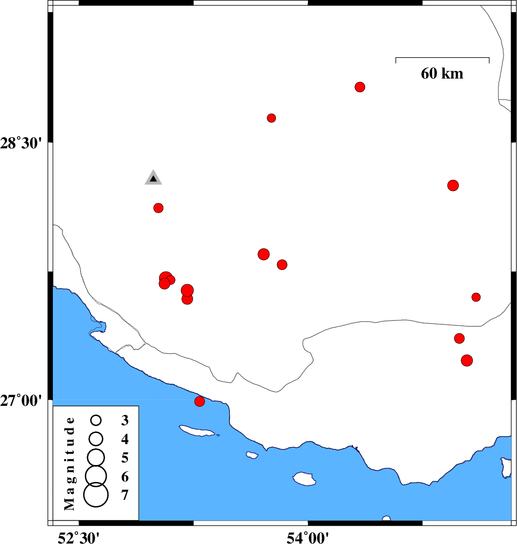 2019/11/30 | 22:56:18.6 | 02:26:18.6 | 27.36 | 54.99 | 14 | ML3 | Hormozgan Province, 65 km North-East of Bastak | ||