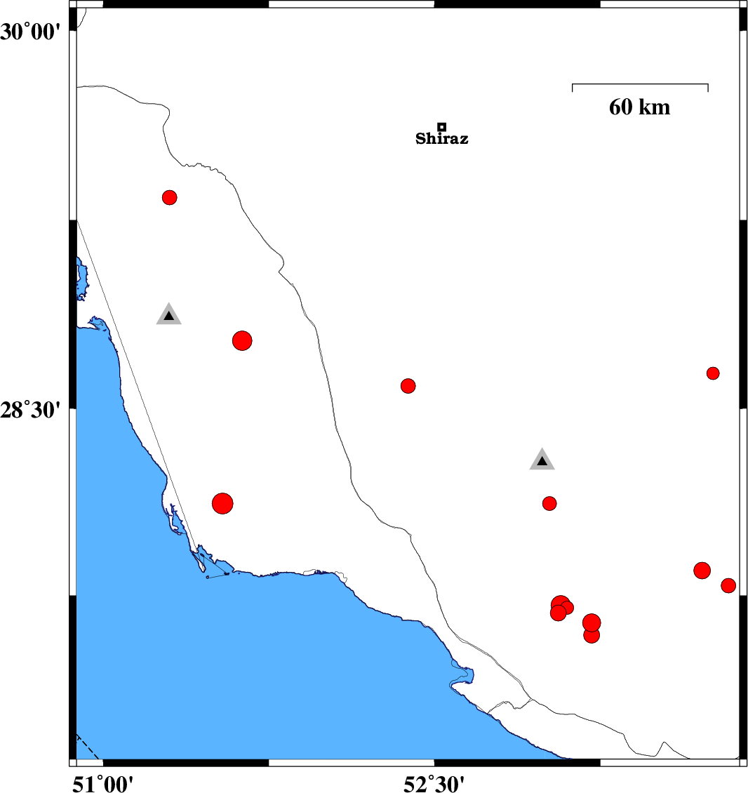 2019/12/02 | 03:07:41.6 | 06:37:41.6 | 28.12 | 53.02 | 20 | ML2.8 | Fars Province, 38 km South of Qir va Karzin | ||