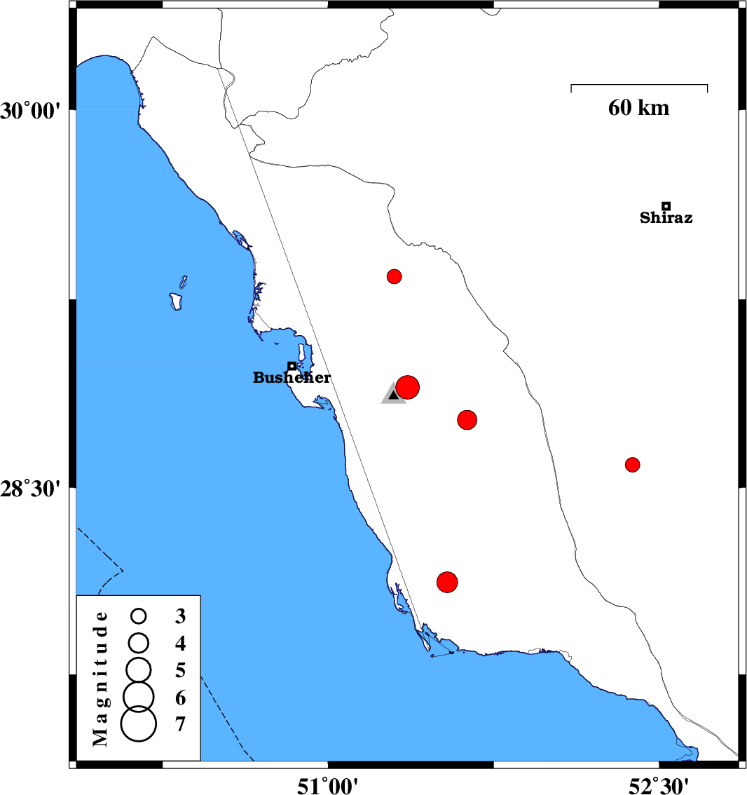 2019/12/27 | 01:53:11.1 | 05:23:11.1 | 28.9 | 51.36 | 10 | ML4.8 | Bushehr Province, 10 km -East of Ahram | ||