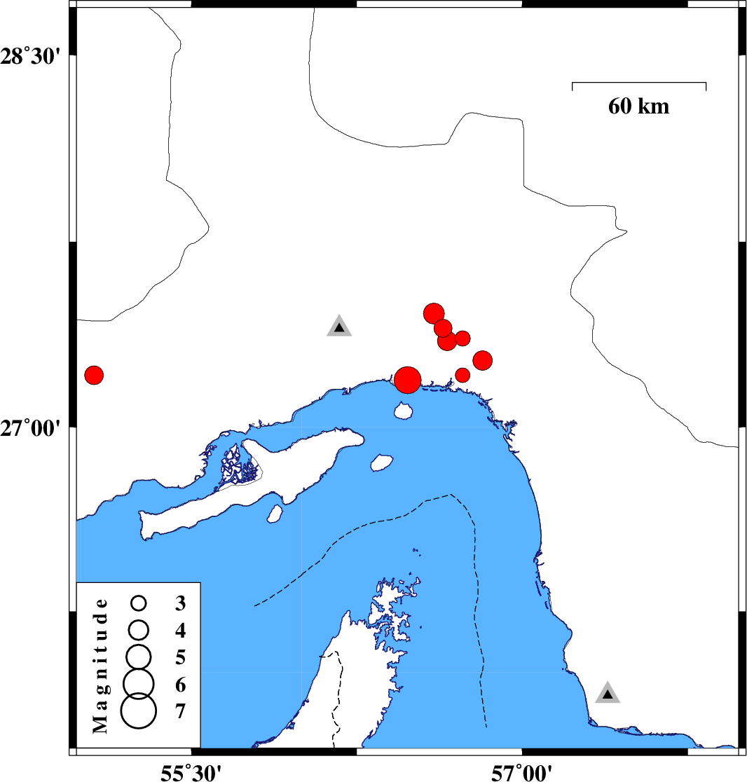 | 2019/12/30 | 13:53:33.6 | 17:23:33.6 | 27.27 | 56.82 | 10 | ML3.9 | Hormozgan Province, 29 km North-West of Minab | ||