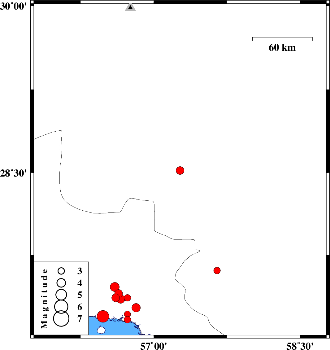 | 2019/12/30 | 13:53:33.6 | 17:23:33.6 | 27.27 | 56.82 | 10 | ML3.9 | Hormozgan Province, 29 km North-West of Minab | ||