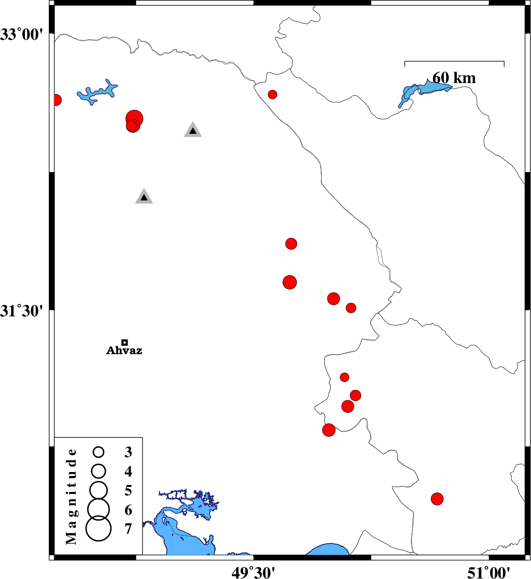 | 2019/12/30 | 09:56:22.9 | 13:26:22.9 | 30.84 | 49.98 | 10 | ML3.6 | Khoozestan Province, 27 km -East of Omidiyeh | ||