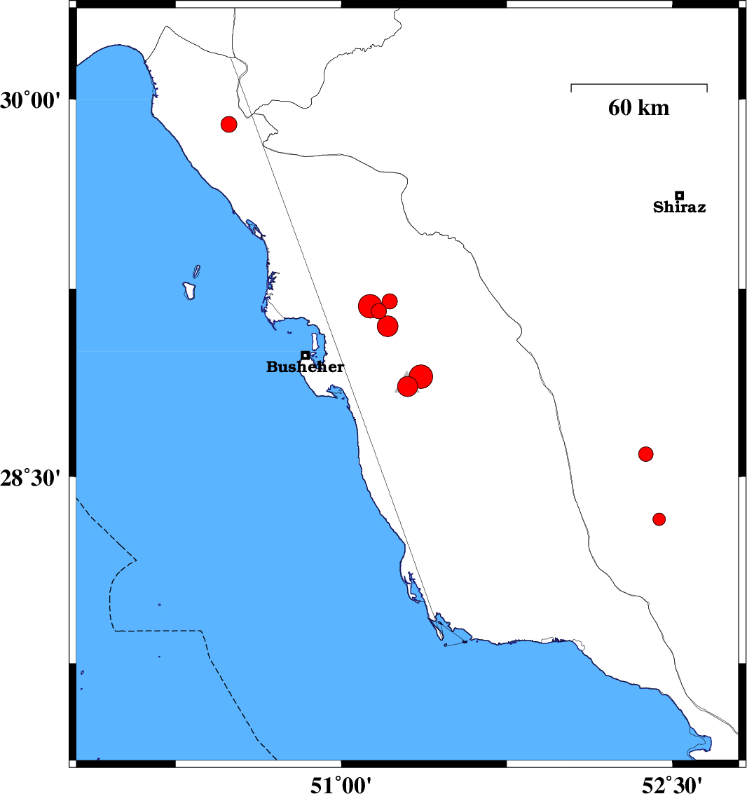 2020/01/08 | 03:46:46.7 | 07:16:46.7 | 29.16 | 51.17 | 10 | ML3.1 | Bushehr Province, 12 km South of Borazjan | ||