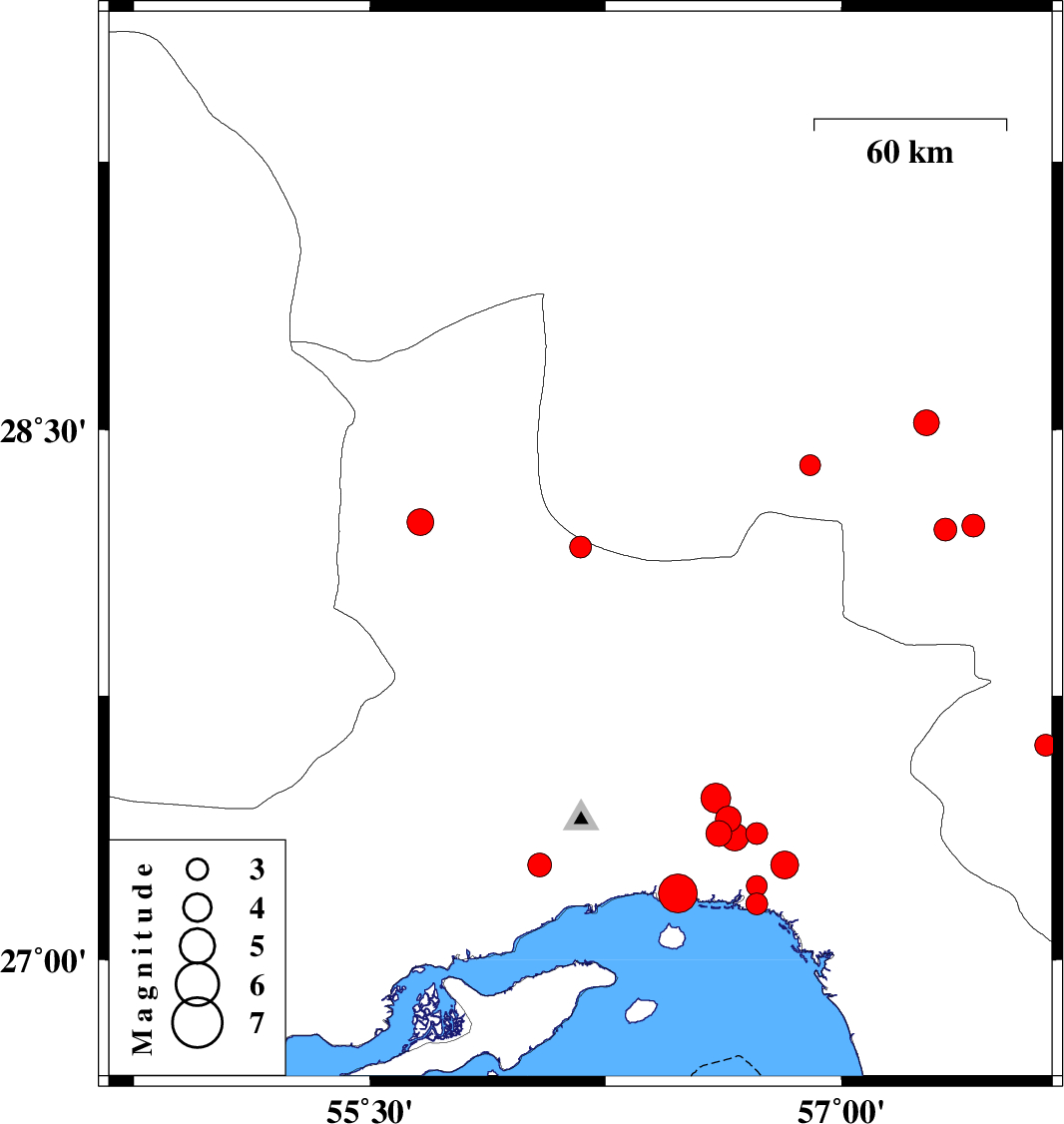 | 2019/12/30 | 13:53:33.6 | 17:23:33.6 | 27.27 | 56.82 | 10 | ML3.9 | Hormozgan Province, 29 km North-West of Minab | ||