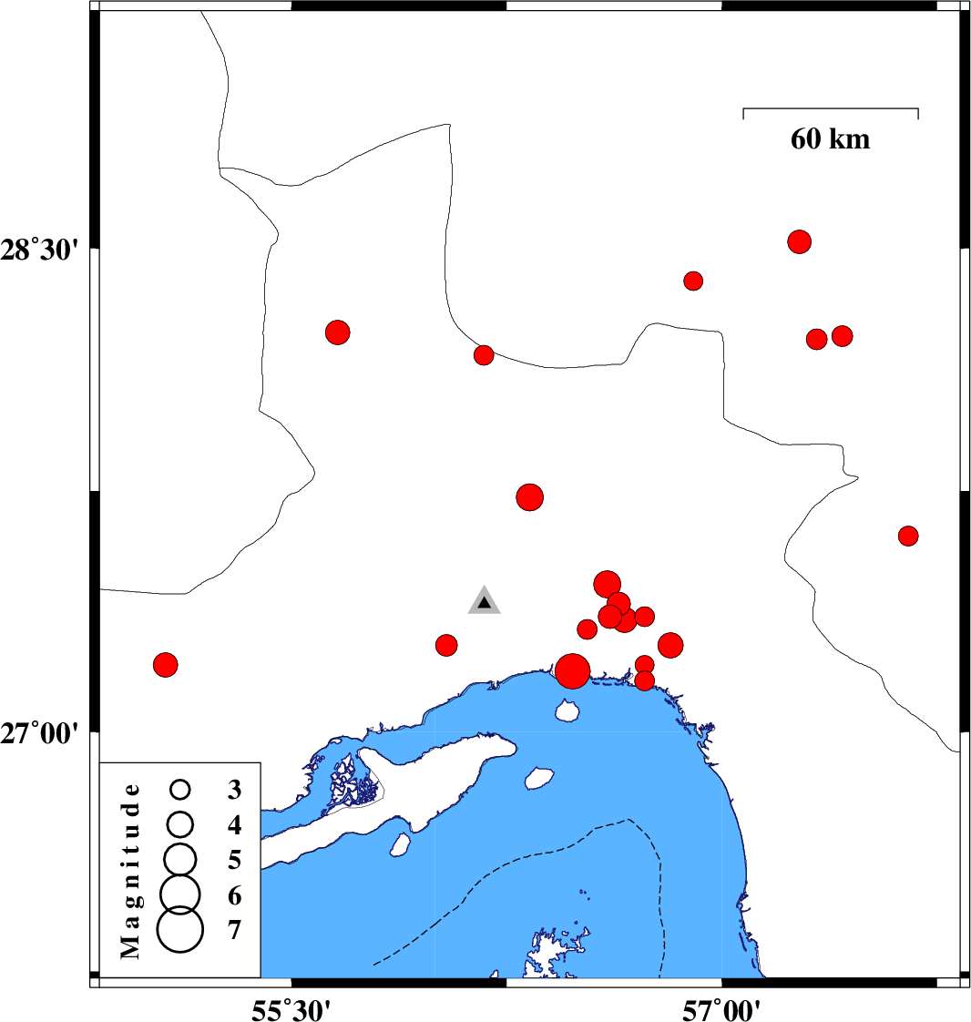 | 2019/12/25 | 22:14:30.9 | 01:44:30.9 | 27.21 | 55.06 | 10 | ML3.8 | Hormozgan Province, 69 km -East of Bastak |