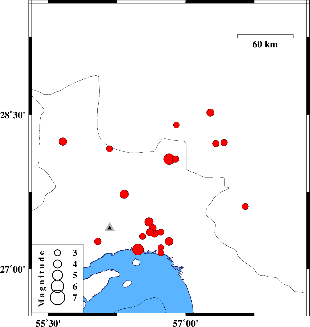 | 2019/12/30 | 13:53:33.6 | 17:23:33.6 | 27.27 | 56.82 | 10 | ML3.9 | Hormozgan Province, 29 km North-West of Minab | ||